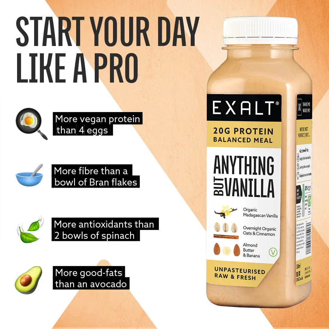 Packed with 20g of EXALT’s Madagascan vanilla vegan protein, it’s as indulgent as it is nourishing, making it the perfect choice to keep you feeling fuller for longer.